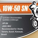 روغن موتور سیکلت پروتک PROTEC 10W 50 SN یک روان کننده با تکنولوژی تمام سنتتیک فعال است. روغن موتور پروتک دارای کارایی بالا است و با رعایت استانداردهای بین المللی API SN (بالاترین کیفیت) و JASO MA2 (استاندارد JASO MA2 کاراترین سطح اصطکاک برای تضمین درگیری کلاچ در حین سه حالت سواری را ارایه می دهد: استارت، شتاب (گاز دادن)، و سرعت ثابت.) توانسته است به یک انتخاب ایده آل برای موتور سیکلت های با دور موتور بالا تبدیل شود. این روغن تمام اجزای موتور را به طور بهینه تمیز نگه می دارد و حتی آلودگی های ناشی از روغن های بی کیفیت قبلی را نیز و تضمین می کند که کارکرد موتور و تعویض دنده روان و نرم باشد.